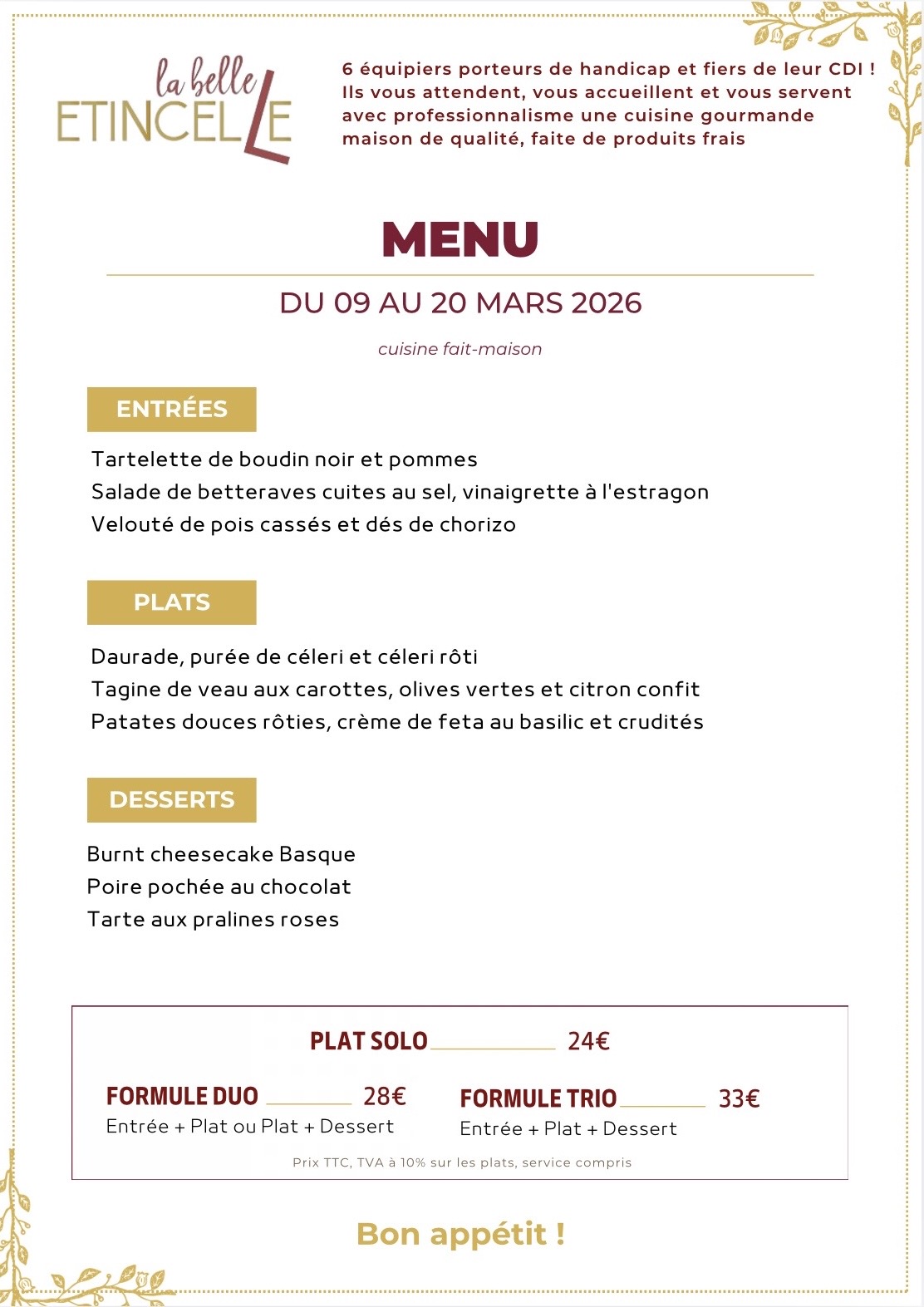 Cuisine française fait-maisonpréparée et servie avec passionpar des équipiers porteurs de handicap